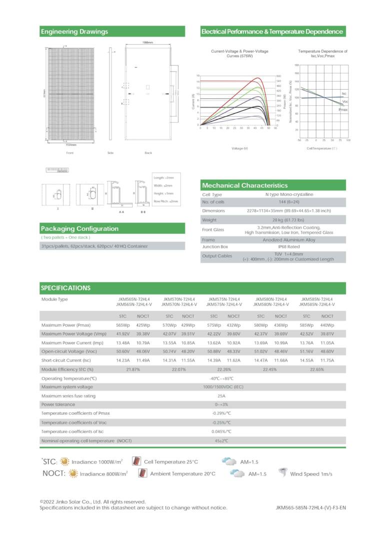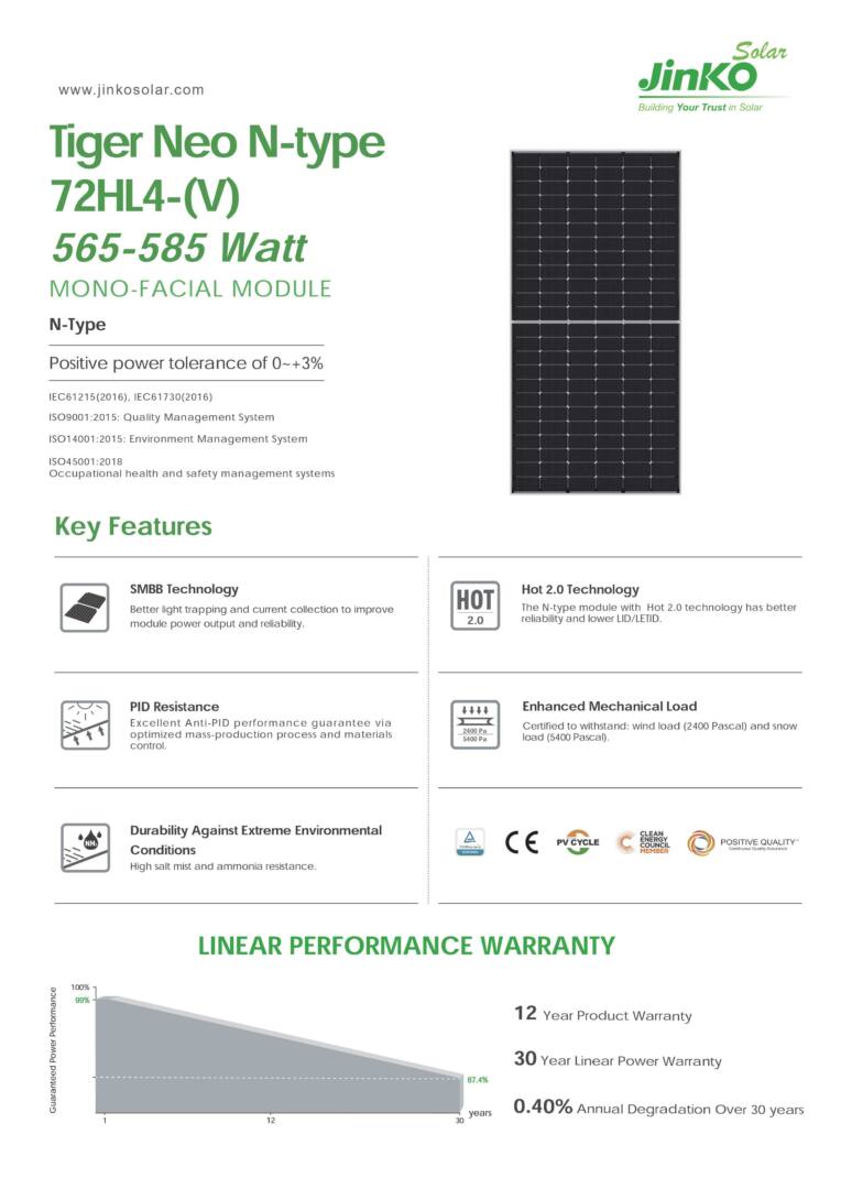 แผงโซล่าเซลล์ JINKO TIGER NEO N-TYPE MONO-FACIAL MODULE 72HL4-(V) 580W.